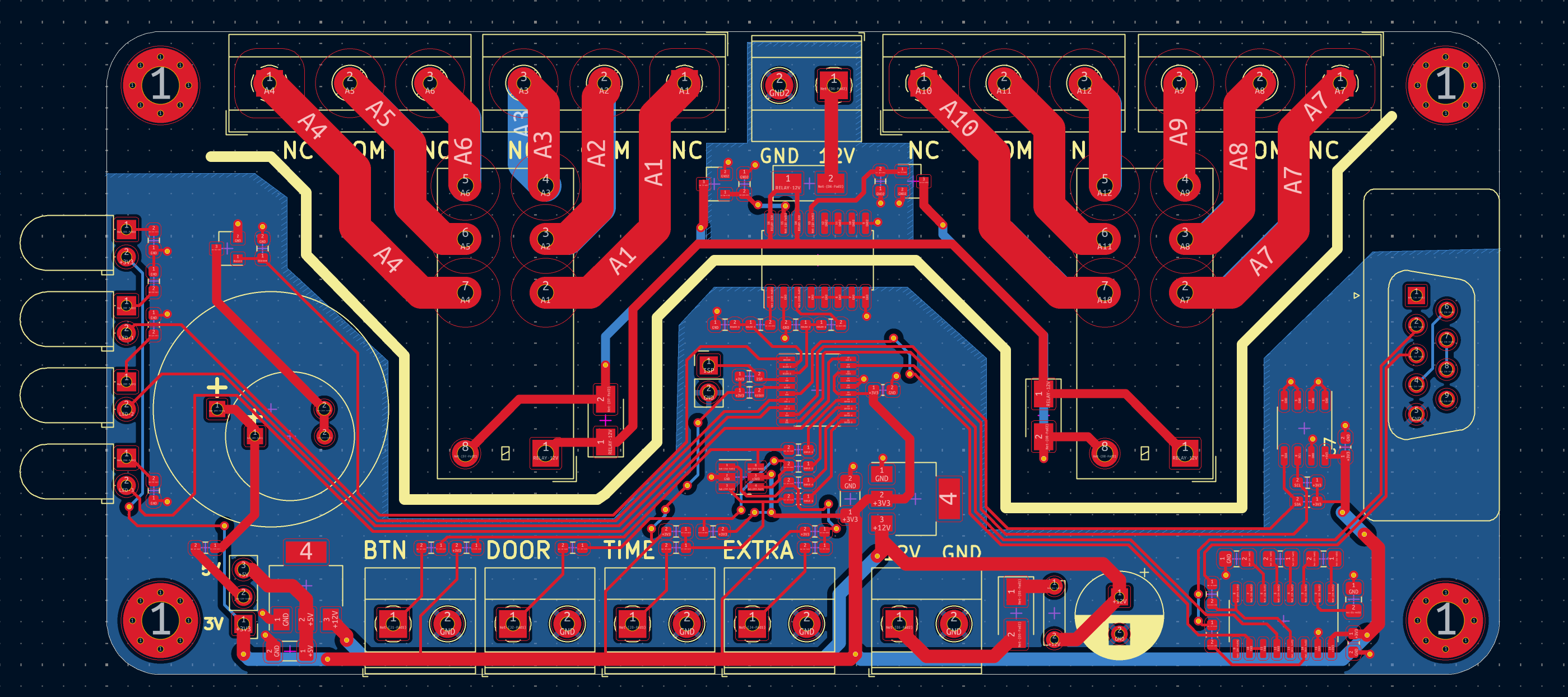 Then we convert the schematic into the physical board, routing every trace. We use narrow traces for digital signals and wider traces for power or relay currents (which must handle a few amps). Red is the top copper layer, blue the bottom. The white line marks the two optically isolated areas. This is a simple two‑layer PCB, though multi‑layer boards are common; modern cell phones often have eight or more layers. Schematic work is engineering; board layout involves art. Two boards can have identical functionality, but only one might make clients say “wow, what a beauty,” even if they’ve never seen a PCB before.